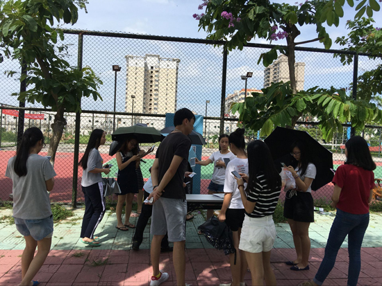 由于活动场地微风习习,导致我们的宣传架无法固定,后来大家只好把它固定在网球场的外围铁丝网上。