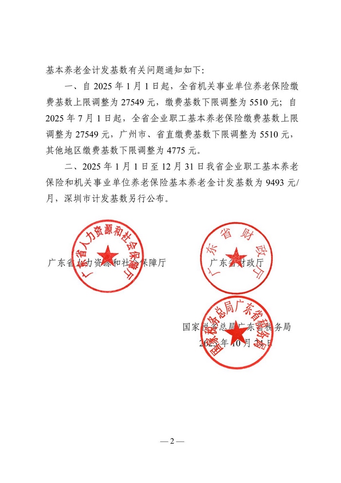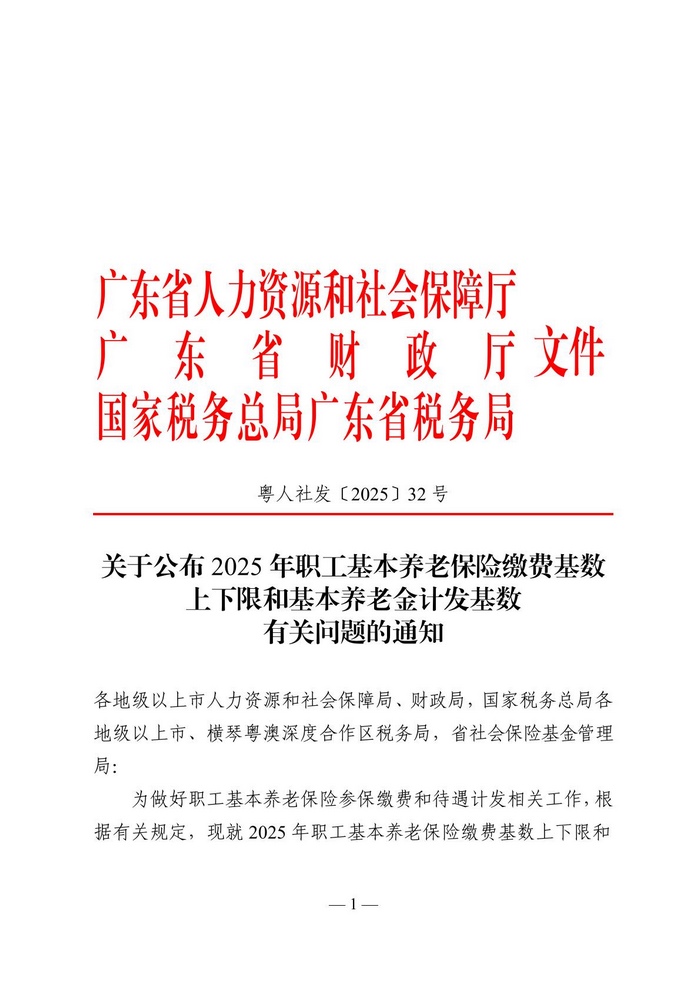 关于公布2025年职工基本养老保险缴费基数上下限和基本养老金计发基数有关问题的通知(粤人社发〔2025〕32号)