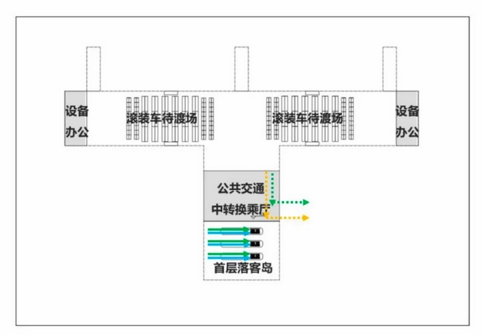 高铁轮渡相互换乘旅客流线:北港高铁轮渡换乘采用同台换乘模式,旅客下船或下车后可以直接在站台完成便捷换乘。