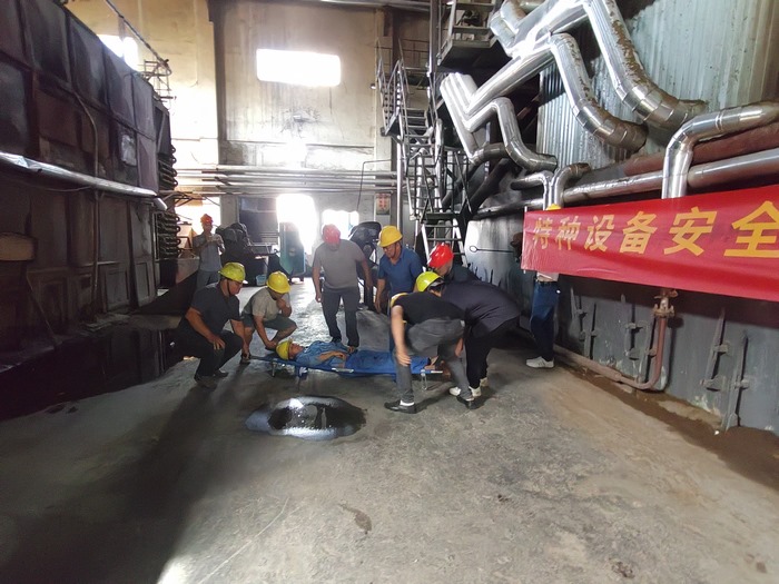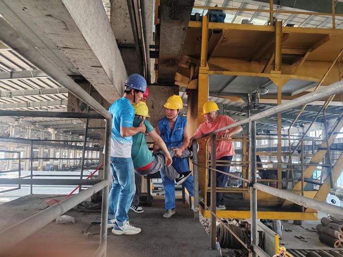 演练现场,各应急小组迅速响应、紧密配合。在蒸压釜事故模拟环节,现场模拟了“操作人员因设备故障导致高温蒸汽泄漏受伤”的紧急情况:警报拉响后,抢险救援组第一时间进入现场,切断设备能源、疏散周边人员,并用担架将“伤员”转移至安全区域;医疗救护组立即对伤员进行心肺复苏、烫伤处理等急救措施;后勤保障组同步设置警戒区,保障救援通道畅通。锅炉事故演练中,操作人员通过远程监控系统发现设备异常及人员受困情况后,立即启动应急预案,技术组迅速介入,精准排查故障根源,制定处置方案;救援组协同配合,安全转移受困人员,及时遏制事故扩大。在行车突发事故模拟中,面对 “行车工晕倒” 的紧急状况,各小组快速响应,通过手动制动控制设备、切换备用电源保障现场安全,高效完成伤员转运与现场处置,整个过程衔接流畅、处置规范。