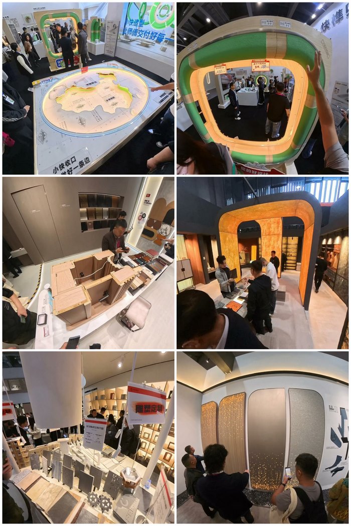 此次参会,我们还有着一个重要的目的,那便是为了更好地服务住宅客户,为他们打造更为优质、舒适的生活空间。因此,我们专门探访了新材料、新工艺的展厅,认真探寻那些能为住宅设计增添更多亮点与品质的元素,作为未来房地产项目方向的关注点,以精装房工程为例,如何摒弃传统思维,靠纯人工、或者是传统材料做造型会有成品瑕疵及成本问题,如何通过运用大量已经预制好的铝收口线条、弧形造型板、复合材料。从而控制施工落地效果量化、标准化以及人工材料成本问题。更加关注如何通过用新型材料,简易工艺,多样式设计手法糅合起来,通过大道至简的方式展现。对于创意样板展示以最简单的方式达到最好的效果。
