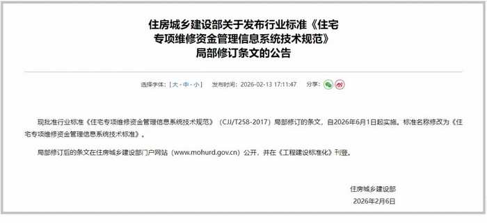 2026年2月13日,住房城乡建设部正式发布《关于发布行业标准〈住宅专项维修资金管理信息系统技术规范〉局部修订条文的公告》。