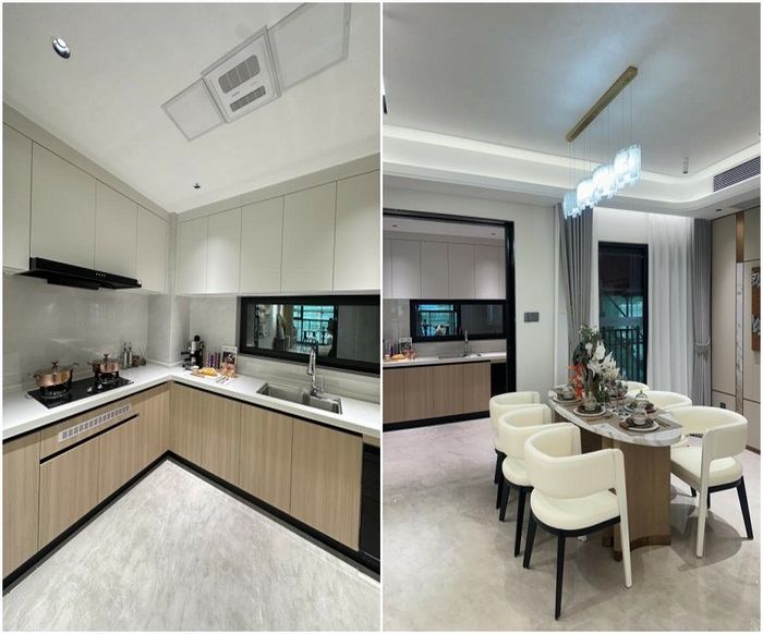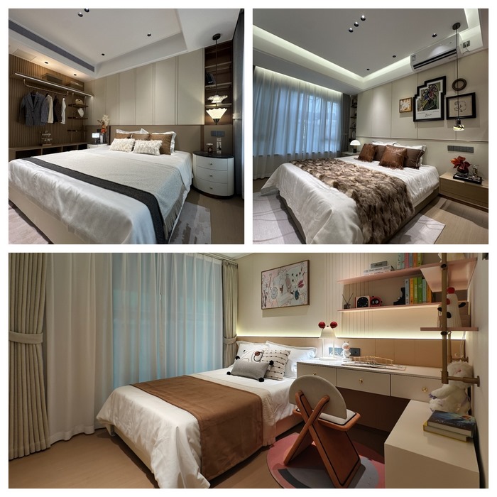 本次交付的样板房以现代轻奢风格为设计核心,摒弃冗余堆砌,匠心甄选岩板、皮革、金属、墙布、艺术涂料、木纹饰面板等高端材质,于细节处营造低调奢华、舒适雅致的居住氛围。