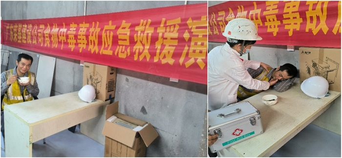 演练设定项目部多名工人用餐后先后出现头晕、腹痛等中毒症状。总指挥启动《食物中毒应急救援预案》。医疗小组到场后立即封存可疑食品并冷藏保存,用温盐水为中毒人员催吐排毒,同时拨打120并派人接应,事故调查组完成取样记录。整个处置流程规范有序。