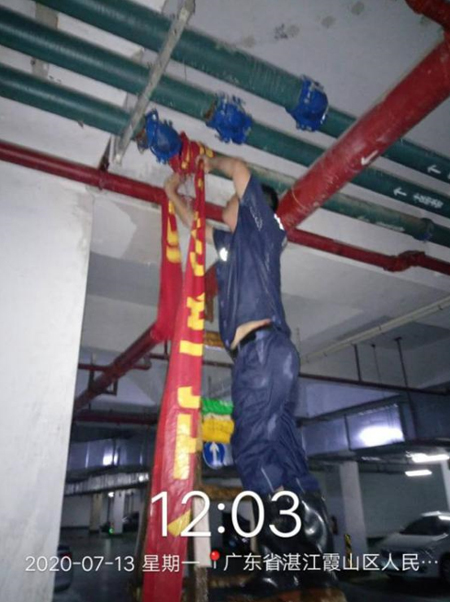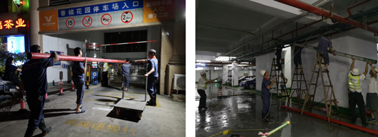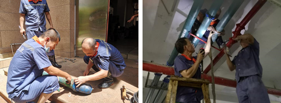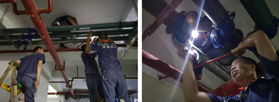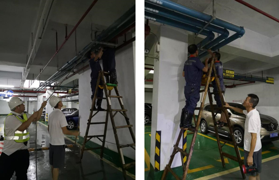 由于该泄漏的供水管属于高压管道(压力达到1.35MPa),并且位于地下车库天花板下方,增加了维修的难度,高温下的地下车库又闷又热,抢修的设备员加班加点拆卸泄漏的管道进行补焊,身上的衣服早已湿透,已分不清是汗水还是自来水,于18:00前完成安装调试。