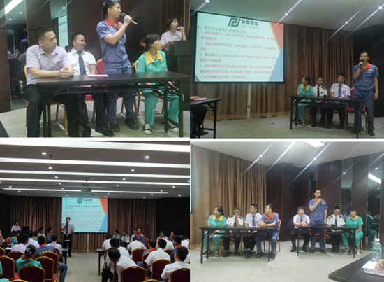 第二部分:竞赛环节。 通过“知识问答”展开第一环节,题目主要选取服务理念培训内容、QPI、考勤管理制度、消防知识等与我们工作息息相关的内容。三个服务中心从各部门中抽选人员组成4组,每组分别由客户服务部、设备班、环境部和秩序维护队人员各派1人组成。