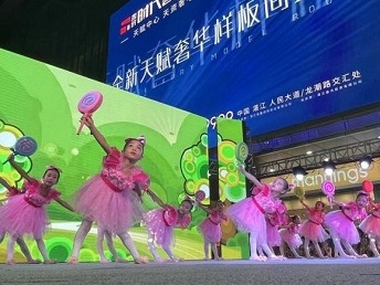 晚上,荣基广场灯光璀璨,舞台上小朋友激情演出,一刹那成为了美丽的风景线。