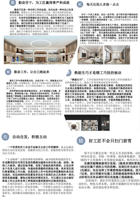 最后大家都纷纷表示:通过这次分享会阅读,让我们明白了“工匠精神”的内涵与精髓所在,并懂得了如何在日后工作中将这种精神更好地投入进去。在以后的日子里我们依然将不断学习,不断阅读,努力向甲方提供更优质地服务,这样才能更好地发挥“工匠精神”。