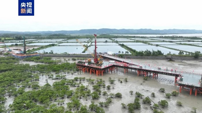 位于广西北海市合浦县境内的铁山港跨海特大桥全长8473.478米,共需施工桩基4332根、桥墩578个、现浇梁及简支箱梁共542跨。其中,海上桥墩99座、海上桩基919根,是合湛高铁全线重点控制性工程,也是目前广西最长的跨海铁路桥梁。施工过程中需要克服潮汐落差大、高盐雾侵蚀、台风强度大等影响,难度较大。