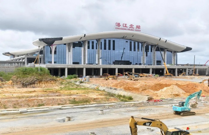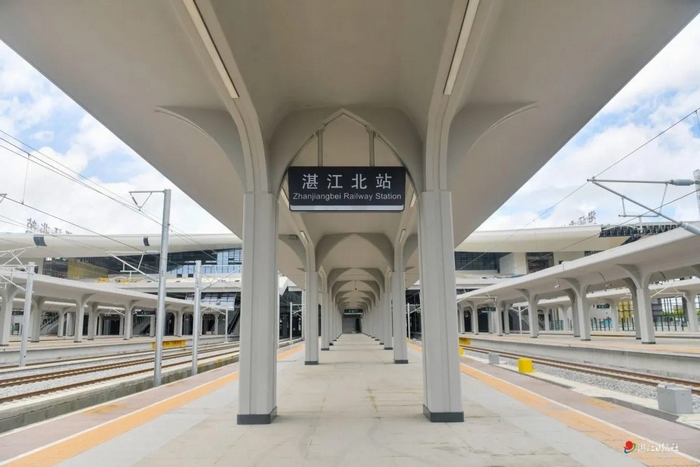 湛江北站是广湛高铁的核心站点,由广东铁投集团所属广湛铁路公司投资建设、中国铁路设计集团EPC总承包,中铁北京工程局施工。该站是采用线上式+线侧式站型的综合型站,总建筑面积10.5万平方米,车场规模6台12线,于2024年3月13日开工,预计2025年12月底竣工。