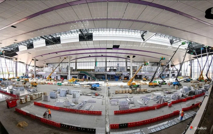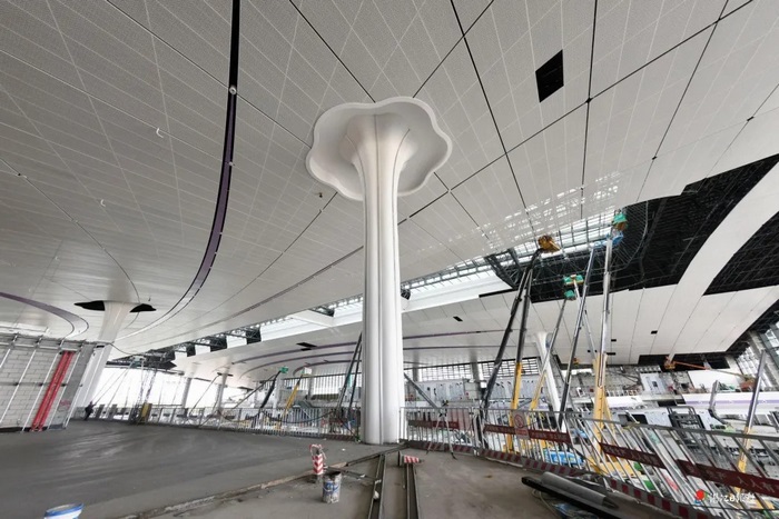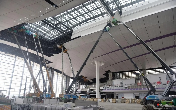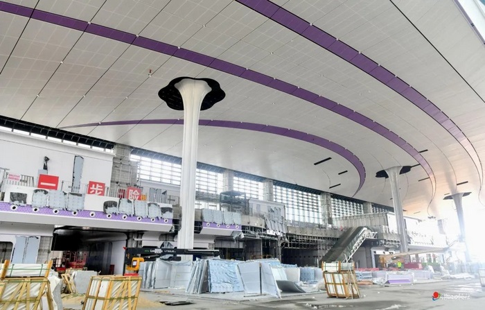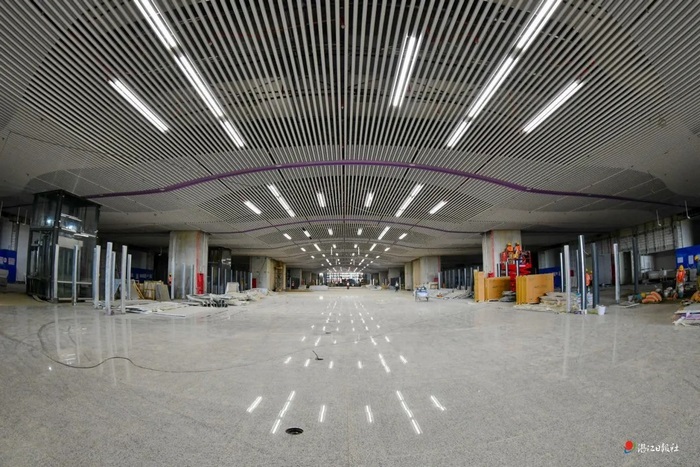 截至8月30日,湛江北站室内装饰装修完成90%,室外装饰装修完成80%,机电安装完成85%。其中候车厅“紫荆花”穿孔板吊顶已完成95%,墙面铝板基本完成,地面石材已开始铺设。