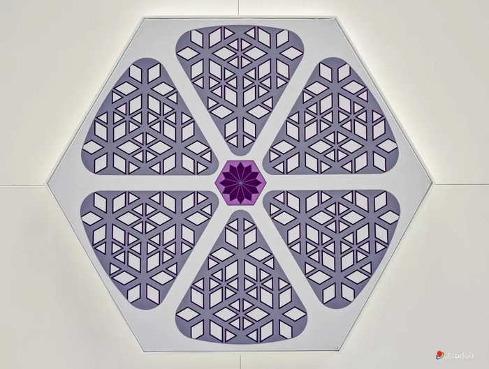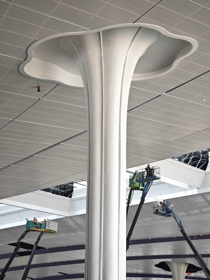 候车厅内装饰简洁大气,以明亮的白色为主色调,点缀紫色流线装饰和紫荆花造型灯饰,处处融入紫荆花元素。层高9.9米的高架候车厅内,8根“花瓣柱”成为视觉焦点——其柱头采用紫荆花朵造型,因曲面复杂,构件加工、制作与安装的精度要求极高,施工难度堪称工程难点。