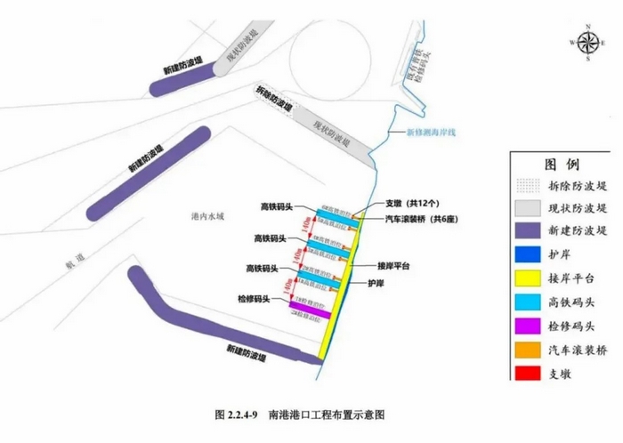 《公示》中附带的报告书显示,北港港口工程的高铁轮渡泊位布置在既有粤海铁路北港港池内,距既有北港普铁泊位约260m处的岸线,总长620m,共布置6个高铁泊位。南港港口工程布置6个高铁泊位和2个检修泊位。