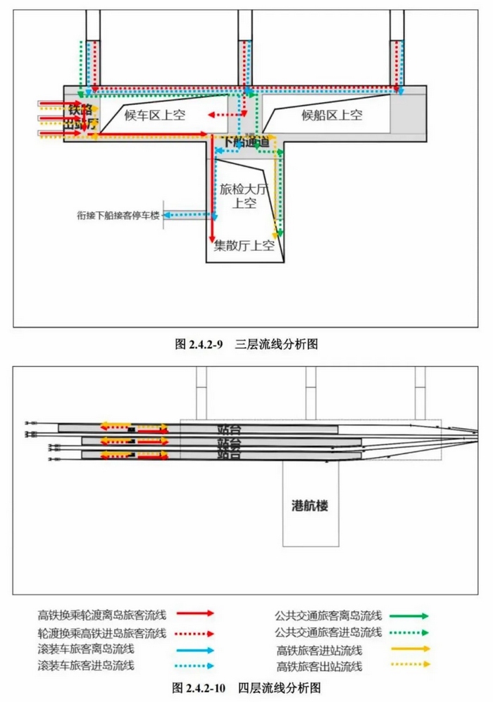 高铁轮渡相互换乘旅客流线:北港高铁轮渡换乘采用同台换乘模式,旅客下船或下车后可以直接在站台完成便捷换乘。