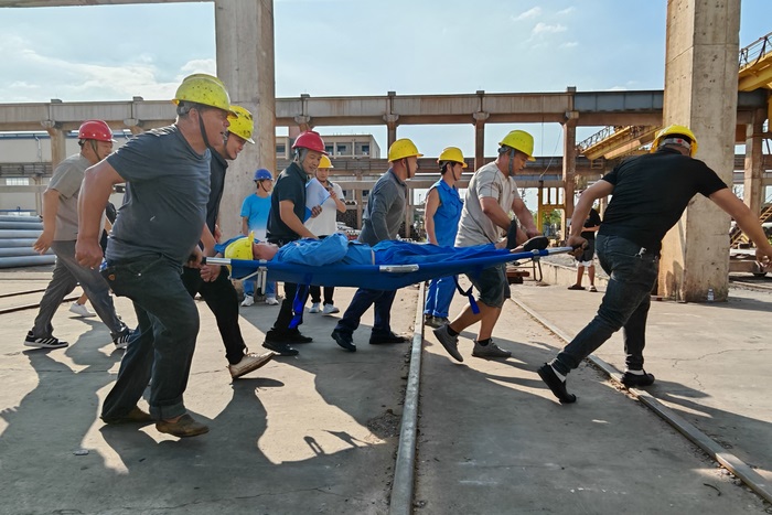 演练现场,各应急小组迅速响应、紧密配合。在蒸压釜事故模拟环节,现场模拟了“操作人员因设备故障导致高温蒸汽泄漏受伤”的紧急情况:警报拉响后,抢险救援组第一时间进入现场,切断设备能源、疏散周边人员,并用担架将“伤员”转移至安全区域;医疗救护组立即对伤员进行心肺复苏、烫伤处理等急救措施;后勤保障组同步设置警戒区,保障救援通道畅通。锅炉事故演练中,操作人员通过远程监控系统发现设备异常及人员受困情况后,立即启动应急预案,技术组迅速介入,精准排查故障根源,制定处置方案;救援组协同配合,安全转移受困人员,及时遏制事故扩大。在行车突发事故模拟中,面对 “行车工晕倒” 的紧急状况,各小组快速响应,通过手动制动控制设备、切换备用电源保障现场安全,高效完成伤员转运与现场处置,整个过程衔接流畅、处置规范。