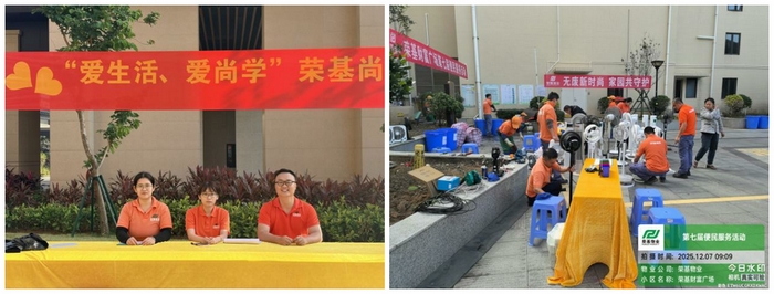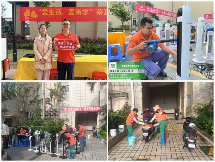 为 深化“真诚服务,成就优质生活”的服务理念,进一步拉近物业与业主的距离,提升小区居住幸福感与归属感,12 月6 日-7日,荣基花园、财富广场、尚学花园物业服务中心携手联动,开展了 “共建美好家园,共享便民服务”活动。活动涵盖风扇清洗、地毯清洁、电动车养护、旧衣置换及垃圾分类学习五大项目,用实际行动为业主送上暖心关怀。