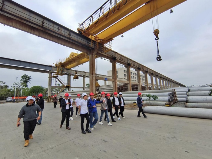 考察团一行深入企业生产一线,重点参观了成品仓储区。龚总详细介绍了公司所生产的各类管桩产品的型号、规格、技术参数及应用领域,并围绕生产工艺、质量控制、市场布局等方面与来访企业家们进行了深入交流。调研过程中,双方就当前建材行业发展趋势、技术创新路径以及企业管理经验等话题展开热烈探讨,现场气氛活跃。