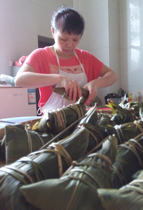 2014年5月30日清晨,我们走到荣基大厦五楼门口,准备到饭堂吃早餐。突然闻到阵阵香飘的粽子味,驻足停留一会,心想着,难道有粽子吃吗?带着疑问,再次深吸一股清新浓郁的香味儿……嗯,是熟悉的粽米香。快,快走,看看是什么回事!我们不由分说地加快了脚步……