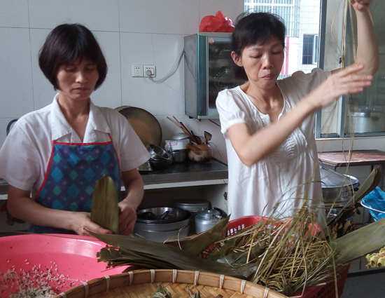 顿时,眼前浮现起荣基饭堂阿姨们辛勤为我们准备端午粽子的情景,她们分工合作,有的清洗粽叶、有的剁蛤蝼搅拌米粒,有的忙着切配菜肉。准备就绪后,阿姨们左手捏住粽叶一角,交叉叠放在左手掌心,右手将准备好的材料均匀分布于粽叶中,向另一角往里卷,再用备好的绳子在粽子尖角附近缠了两圈,下面用力一拉紧,结上绳头,一个漂亮的粽子就成了。